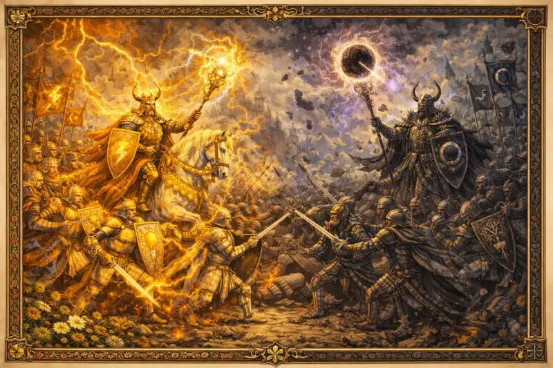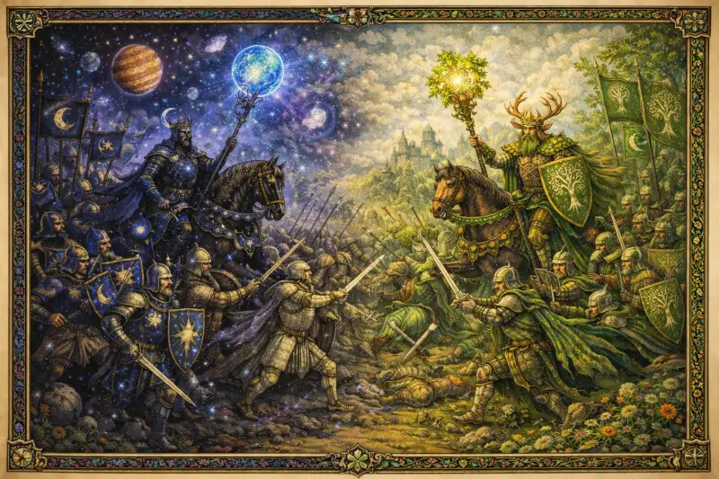 The Great Leviathan by Gideon Flux is the sworn testimony of Gideon Flux, a Star Weaver who documents the cosmic events following a "Great Schism" in the year MMXXIV. Flux is revealed to be one of the fourteen Lords of all cosmic phenomena (including Light, Darkness, Time, and Gravity), whose rule over the Organic Earth is maintained by armies that are the desires and atoms of reality. The true sovereign above these Lords is the Great Leviathan, whose skin forms the paradoxical cosmic crown known as the Eigen-Knot, a self-crossing spindle-torus called the Hype-Shape, which sustains the cosmos through its inherent geometrical flaw.